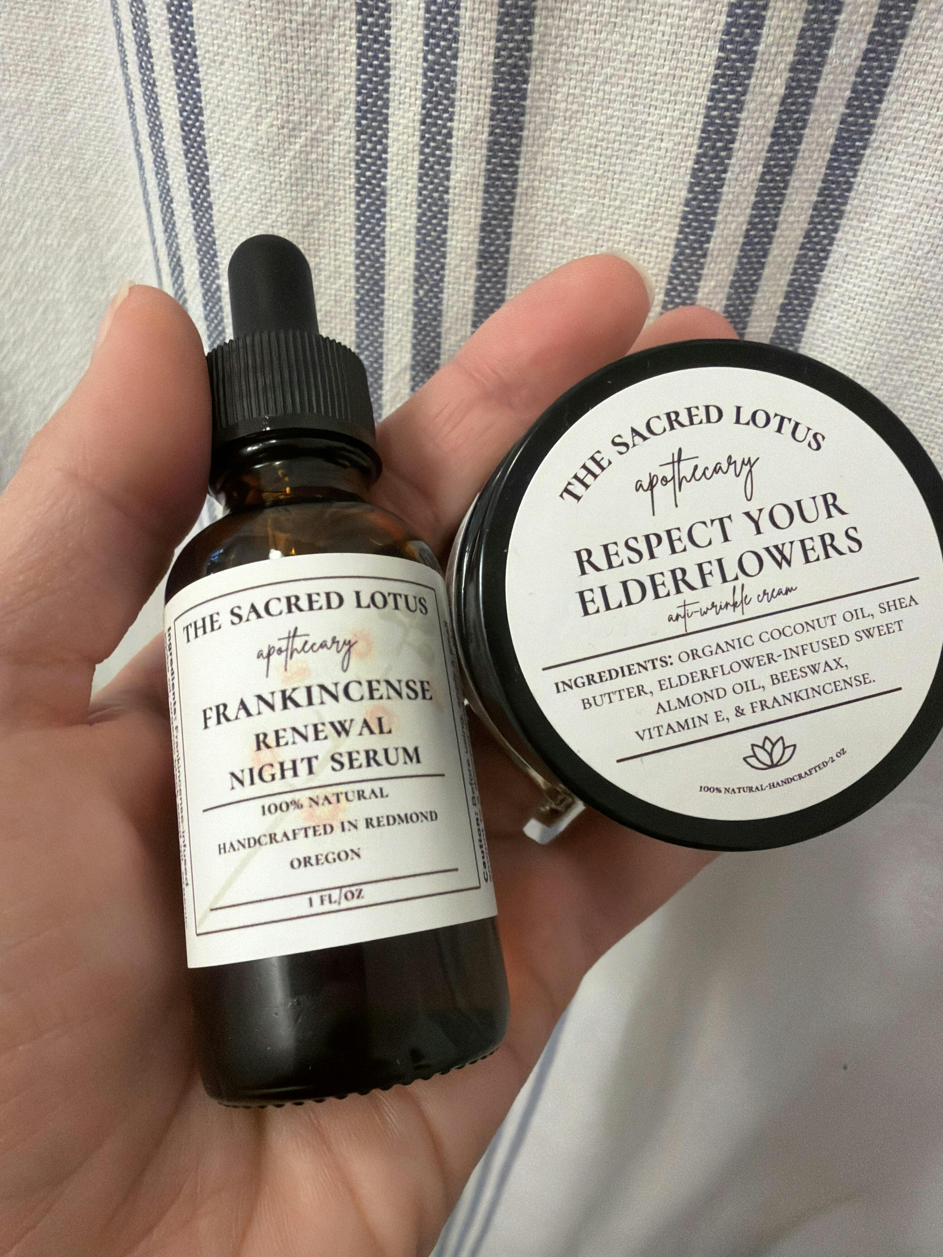 Unveil luminous, youthful skin with our Frankincense Renewal Night Serum — a deeply restorative botanical blend designed to soften fine lines, improve tone and texture, and nourish your skin while you sleep. Crafted with a slow, heat-infused frankincense oil base, this serum carries the sacred essence of frankincense resin, long revered for its skin-supportive and energetically grounding qualities.